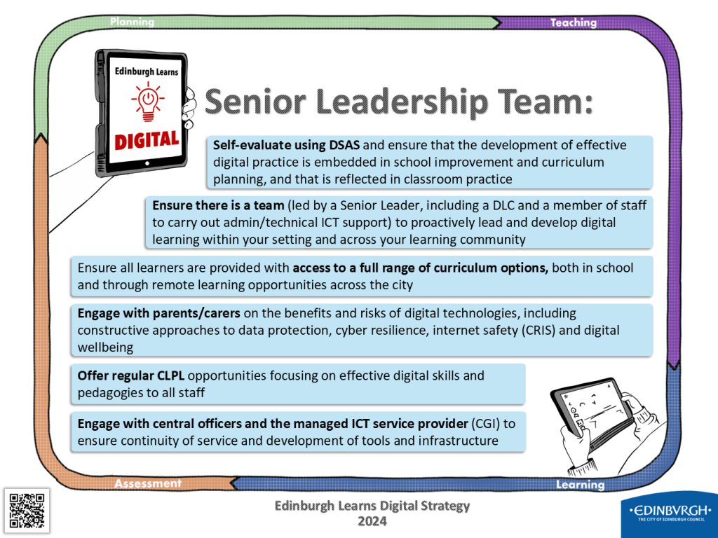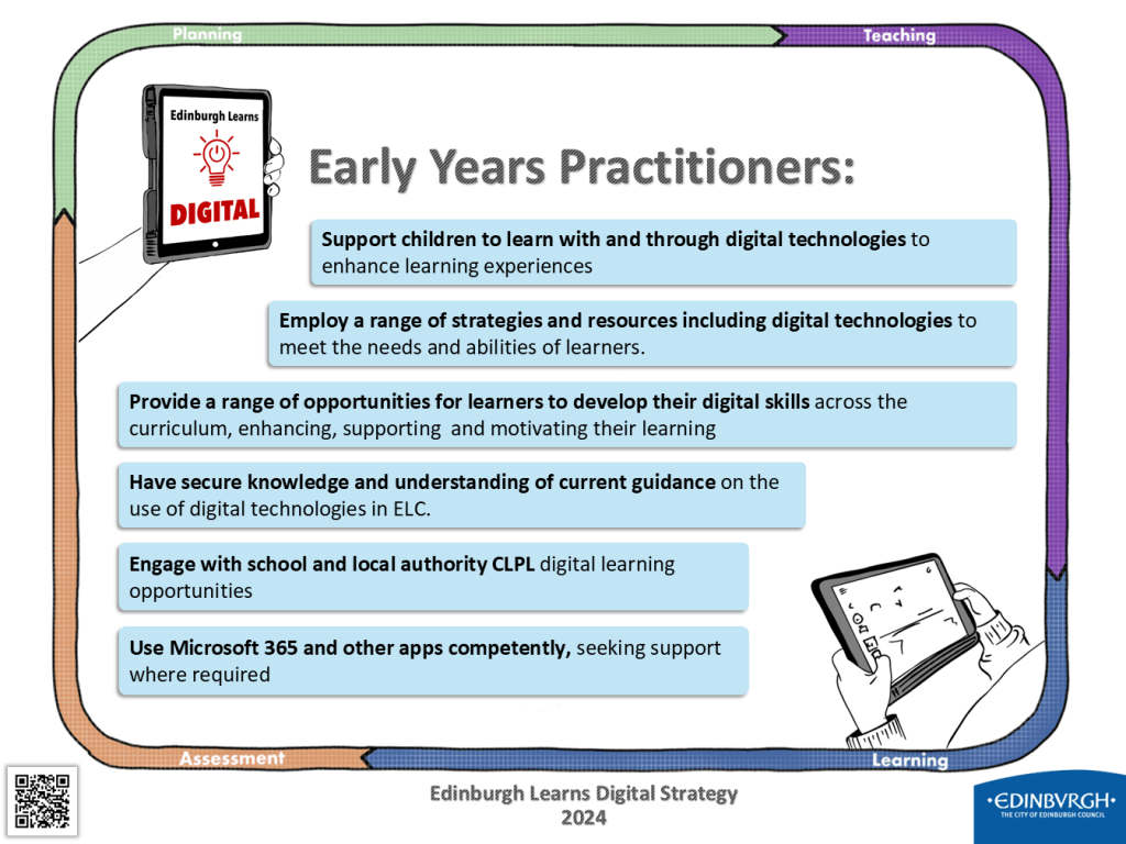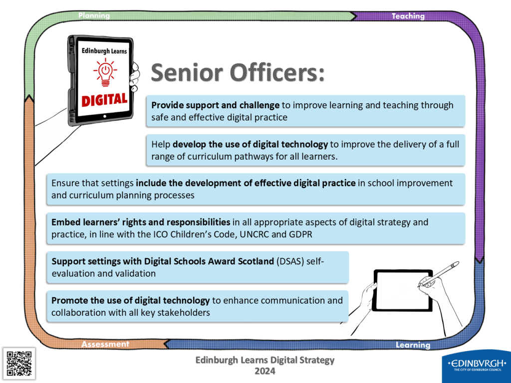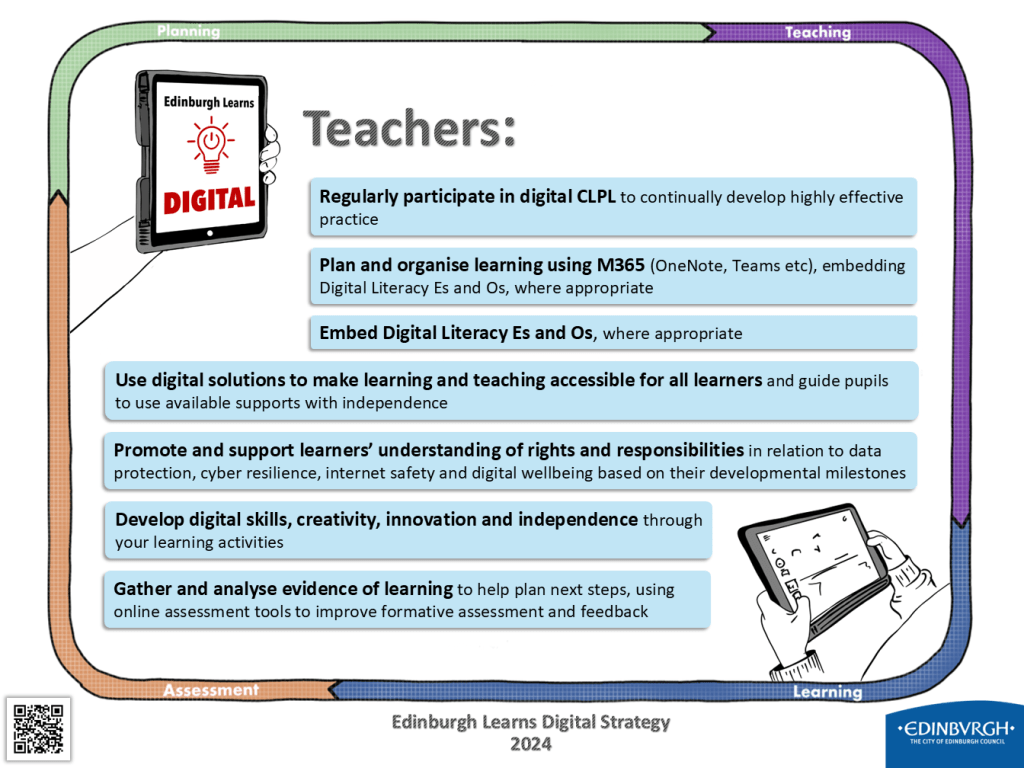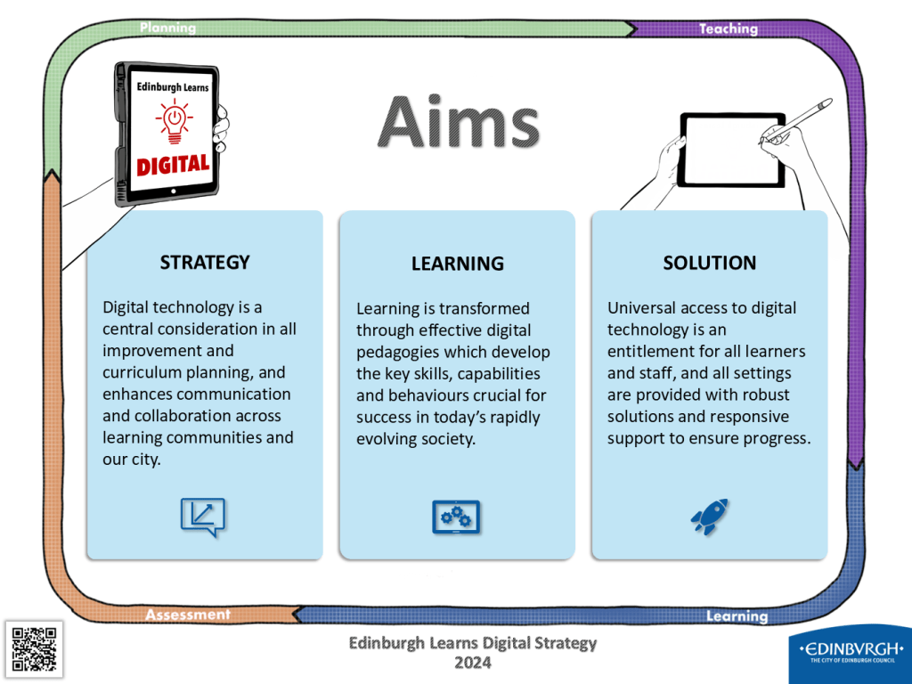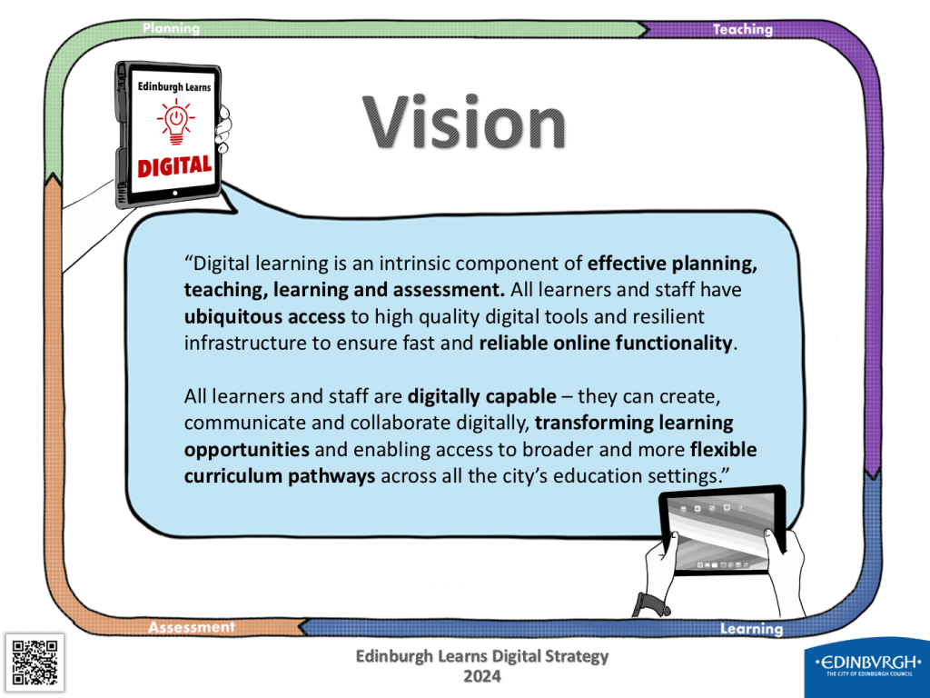 Our Digital Strategy sets out a clear vision for how digital technology can and should enhance learning and teaching in Edinburgh schools. It aims to ensure that everyone in our schools have access to high-quality digital tools, and the skills needed to make the most of the digital world around them.