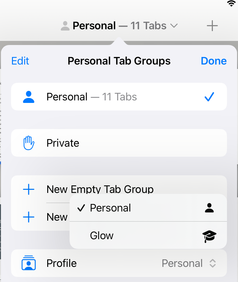 - Tap the Profile menu and then chose the appropriate profile. Tap Done. Safari will switch to that profile.