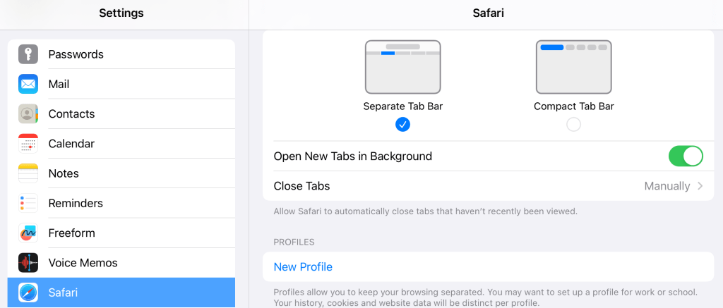 iPads that have been updated to iPadOS 17 can create multiple profiles in Safari. Profiles keeps logins separate, similar to method 2 above, but using only Safari.